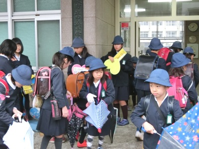 1月17日(水)、久しぶりの"雨"です。8時5分、学校の正門が開けられると同時に、一斉に登校【写真左】しました。玄関では、図書委員会の児童が「あいさつ運動」を行いました。みんな、玄関先で傘をたたんで、元気よくあいさつをしていました。3学期が始まって1週間がたって、やっと平常に戻ったようです。