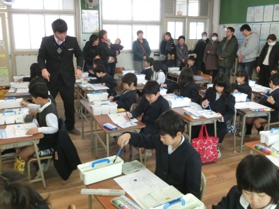 2年生の2限は、図工の授業「カメレオン大さくせん」【写真左】で、水彩絵の具の黄色と青色を混ぜ合わせて、緑色をつくる学習をしました。
