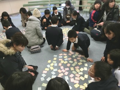 3限は、引き続き多目的室で国語の「みんなで百人一首をしよう」【写真右】でした。保護者の方も入って、百人一首の学習をしました。