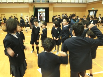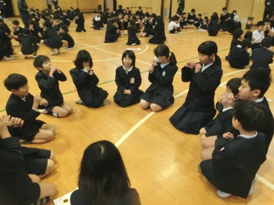 2月1日(木)、今日は「給食週間」が終わって初めての児童集会でした。最初に、給食調理員さんへ感謝の気持ちを込めたお礼の手紙を渡しました。その後、「落ちた落ちた、なあにが落ちた 」をしました。