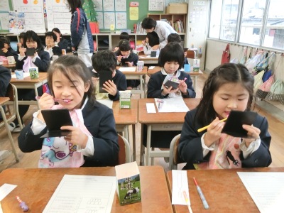 第一大臼歯やむし歯菌、歯垢について勉強をしたあと、前歯に赤い「歯垢染めだし液」【写真左】を塗ってもらいました。その後、歯ブラシの持ち方や正しい歯磨きの仕方を教えてもらって、鏡を見ながら一本ずつ丁寧に磨き【写真右】ました。一人ずつ口を開けてみてもらった結果、全員が「歯みがき名人」になりました。ご家庭でもおうちの人と一緒に、鏡を見ながら「歯はみがき名人」を目指しましょう。