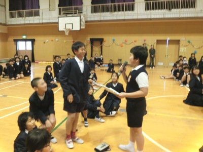 みんなで遊ぼうは、「6年生クイズ」で、なかよし班にわかれて「〇×クイズ」を行いました。「修学旅行のピレネーに乗って泣いた人がいる。林間学習の肝だめしでリタイアした人は3人いる。」など、6年生に関する楽しいクイズでした。そして一問ごとに集会委員が6年生にインタビュー【写真左】をしました。