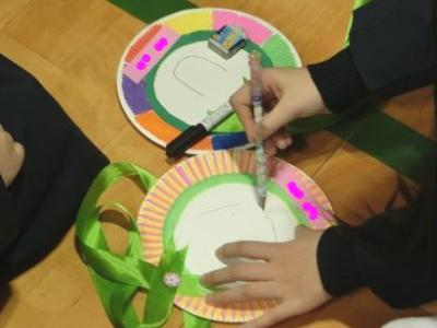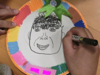 なかよし班タイムは、「6年生の似顔絵を描こう」です。なかよし班の5年生から1年生が順番に、輪郭・髪の毛・目・まゆ毛・鼻を描き、みんなで耳と口を描いて、6年生の似顔絵メダル【写真中・右】を完成させ、プレゼントしました。