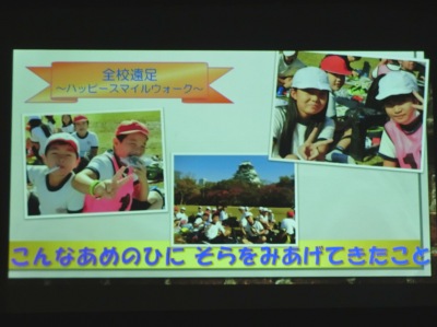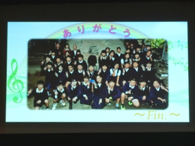 最後は、「みんなで歌おう」です。この1年間のなかよし班活動の映像をスライドショー【写真左・右】で流しながら、207人全員で「RAIN(レイン)」の曲を歌いました。アンコールがあり、2回歌いました。