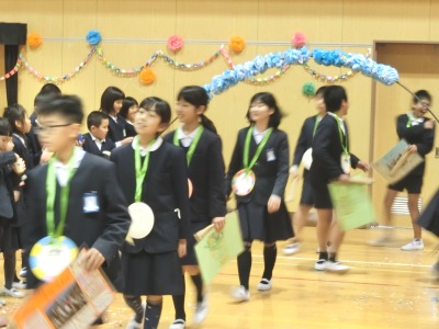 卒業生は「似顔絵メダル」と思い出の「カード」を持って、在校生の花道を通って退場しました。在校生は紙クラッカーで紙吹雪を飛ばしながら見送りました。最高の思い出になった「はばたき集会」で、207人分の笑顔と「ありがとう」の感謝の気持ちをあふれさせた集会になりました。