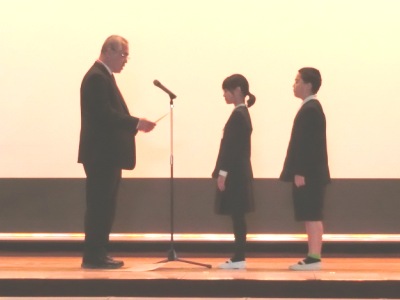 3月12日(月)始業前、今年度最後の児童朝会は、「城東区学校保健協議会創立60周年記念作文」の賞状伝達【写真左】がありました。その後、教頭先生から7年目を迎えた「東日本大震災」の新聞記事をとおしてお話がありました。