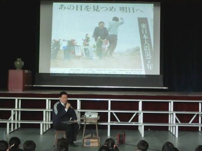 あの日のことや身近にいた大切な人を忘れないために、11日にたくさんの人がそれぞれの思いで手を合わせました。いろいろな人のいろいろな考え・思いを知ることで、相手の気持ちを想像できるようになります。心が豊かになります。学校では、そうした勉強もしてほしいと思うから、いろいろな人のことを紹介します。教室では、担任の先生からいろいろ人の考え・思いを聞いていることでしょう。先生たちのことを信じて、心を豊かにしていってください。先生たちもみんさんのことを信じています。