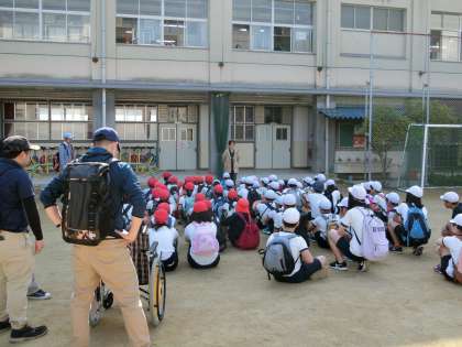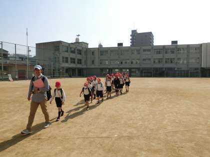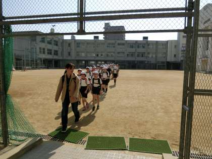 4月20日(金)5・6年生が奈良方面へ出発しました。とてもいい天気で、遠足日和です。出発式【写真左】をして、いざ奈良へ。いってらっしゃい。