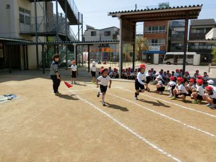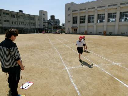 4月20日(金)午前、1年生と2年生がいっしょにスポーツテストに取り組みました。【写真上・中】今日は運動場で50m走をしました。みんな一生懸命走っていました。よくがんばりました。