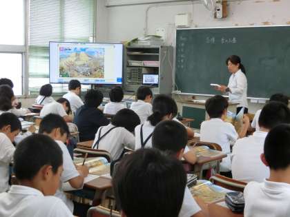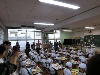 4月24日(火)午後、1年生から6年生までが、「学習参観・学級懇談会」を行いました。今年度初めての参観ということもあり、多くの保護者の方々にご来校いただきました。ありがとうございました。 (1年生【写真上】は給食参観でした。今日は甘夏かんをがんばって食べていました。5年生【写真中】は国語の授業で、「一つの言葉から」。6年生【写真下】は、社会科の「古墳と大王」)今日の学習参観の感想や学級懇談会の様子などは、ぜひお家でも話しあってください。