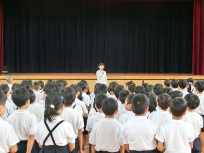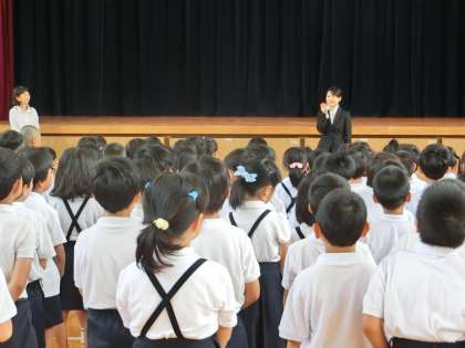 6月11日(月)朝、児童朝会がありました。校長先生からは、「6月は食育月間です。給食もしっかり食べてましょう。そして、元気で健康な体をつくりましょう。」という話がありました。その後、教育実習の先生のあいさつがありました。
