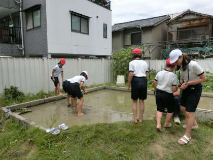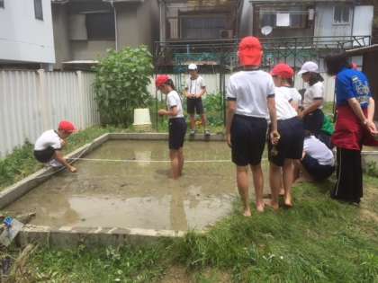6月13日(水)午前、5年生は梅雨の晴れ間に田植えを行いました。みんな裸足になり、一束一束ていねいに植えていました。実りの秋になりますように。