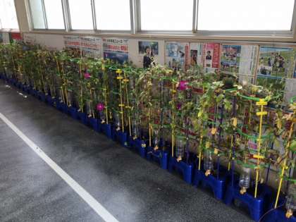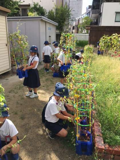 台風襲来に備え、1年生は月曜日の下校時に朝顔の鉢植えを屋内に移動させました。