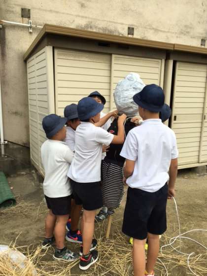 中浜水田の稲穂が実りはじめ、すずめが大挙して訪問するようになりました。子どもたちは協力して水田の周りにテープを張り、かかしを作って立てました。収穫までもう少し、大切なお米を守ってくれるといいですね。