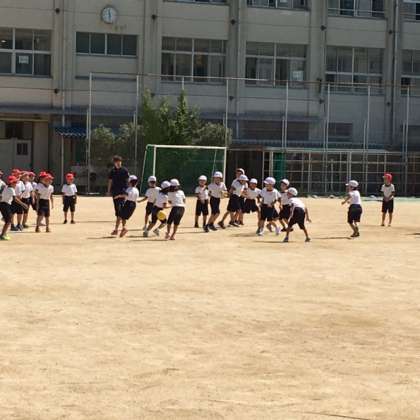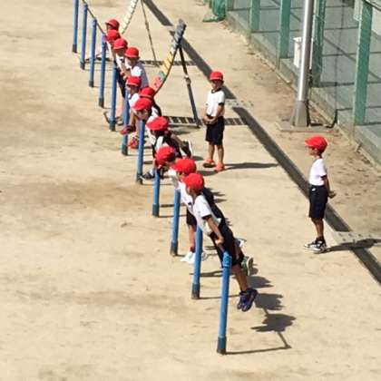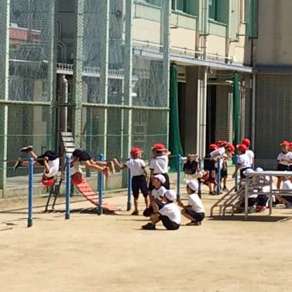 体育の授業、1年生は鬼ごっこでウォーミングアップをした後、鉄棒の練習、そして、ドッヂボールをしました。