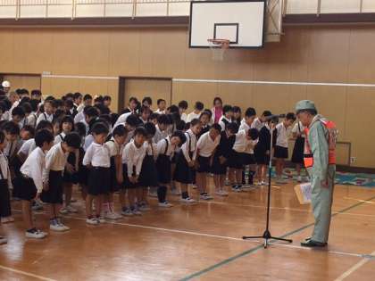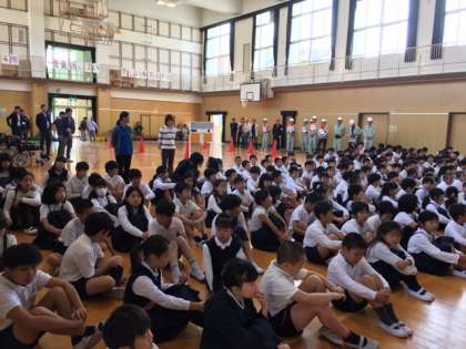 中浜地域の防犯防災に携わっておられる皆さまに、消火活動、車いすの操作方法、AEDの使い方や心臓マッサージの方法を教えていただきました。子どもたちは真剣なまなざしでお話を聞き、一生懸命、体験活動に取り組みました。