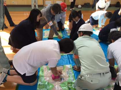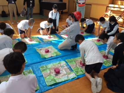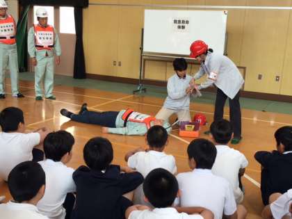 救急救命体験では、倒れている人の救助活動の模範を見せていただき、「アッパくん」を使って心肺蘇生の体験をしました。