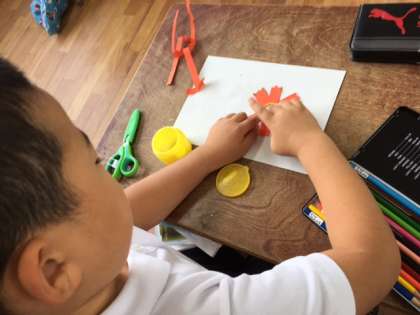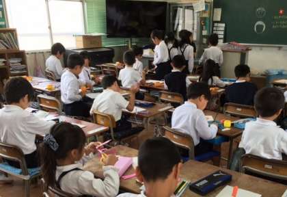 1年生が図工の時間に画用紙を使ってお花作りをしていました。ひとりひとり手作りしたお花で一つの作品ができるようです。完成が楽しみです。