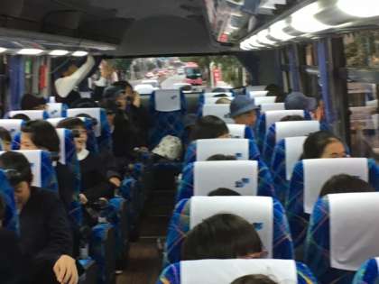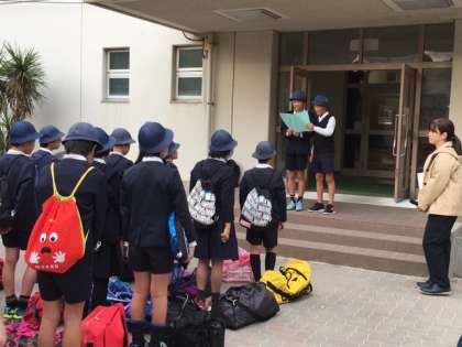 大きな荷物を抱えて元気に登校しました。出発式を終え、7時20分過ぎ、6年1組の子どもたちを乗せたバスが出発しました。早朝からたくさんの皆さまに見送っていただきました。ありがとうございました。