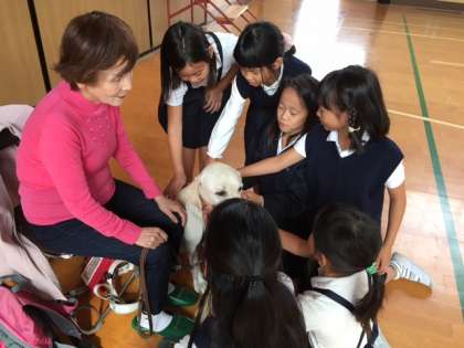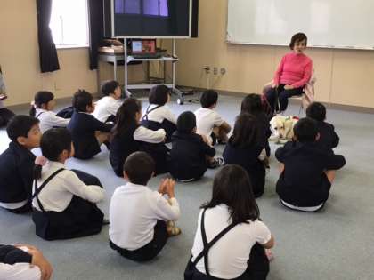 2、3時間目、ゲストティーチャーをお招きし、盲導犬について教えていただきました。盲導犬は、目の不自由な方に曲がり角や段差、障害物があるのを知らせ、安全に歩けるよう助けてくれます。いろいろな訓練を受けて必要な指示をしっかりと聞き分け、盲導犬としてのお仕事ができるようになるそうです。