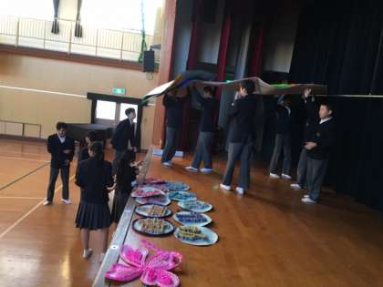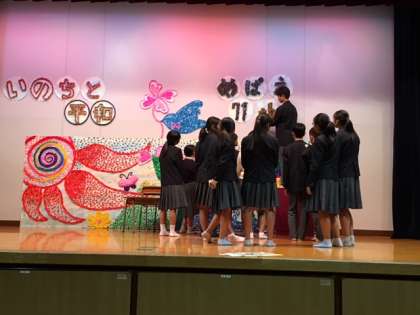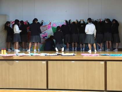 今年の作品展は、城陽中学校2年生のみなさんが共同制作した折鶴アート『めばえ』を特別展示しています。11月15日夕方、本校を卒業した子どもたちが大きな作品を運んで、講堂舞台に展示してくださいました。一羽一羽心をこめて折った鶴が作り出す美しい作品をご鑑賞ください。