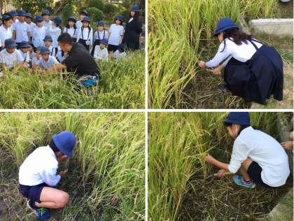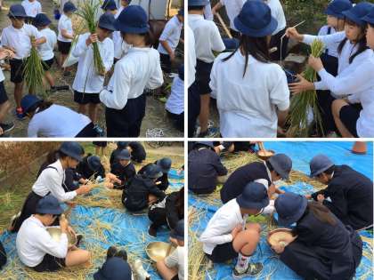 12月4日、5年生が学習園の水田で育ててきた『なかはま米』を家庭科の調理実習で炊飯しました。6月13日の田植えから始まり、9月に入って稲穂が実ってきたころ、かかしを立て、10月の稲刈り、乾燥、11月の脱穀を経て、美味しいお米ができました。