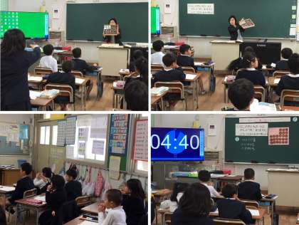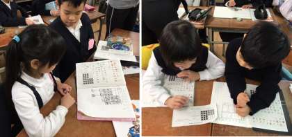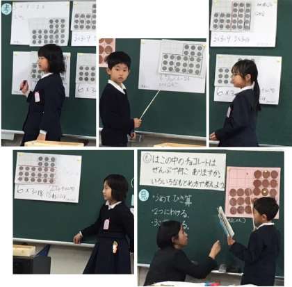 2年生は、これまでに身に着けた『九九』を使って、お菓子箱の中のチョコレートの数を求める方法を考えました。先生のヒントを聞きながら、同じ数のまとまりでわけて足し算する方法や全体からから引き算する方法など、ひとりひとり自分が気づいた方法で計算し、ペアで一緒に考えたり、隣の席の人に解き方を説明したりしました。『かけ算』を使うと計算で個数を求めることができることや求め方にもいろいろな方法があることに気づくことができました。