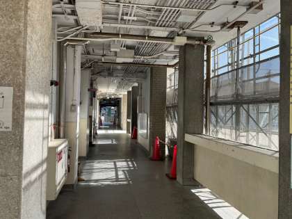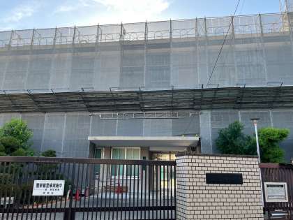 ご存知の通り、職員室のある校舎の壁面工事が始まっています。囲いをしているので、写真のように昼間でも職員室前のろう下は暗くなっています。また、明日は二学期の始業式ですが、給食も始まります。