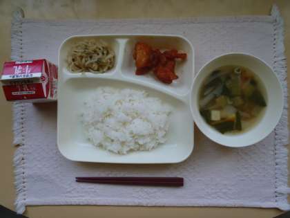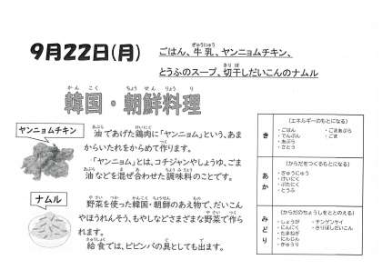 ヤンニョムチキンのヤンニョムソースは、給食室で手作りしています。みりん、濃い口しょうゆ、ケチャップ、コチジャンを合わせてたものを煮たてて作ります。本場韓国・朝鮮では、唐辛子の粉や、にんにく、しょうが、ごま油などが入るようですが、給食は、子ども向けにマイルドな辛さにしています。