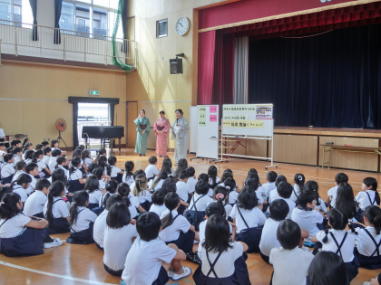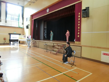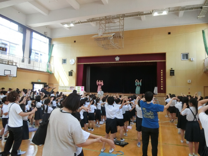 本日琉球舞踊の講師の方に来ていただき、芸術鑑賞を行いました。琉球舞踊の踊り方と楽器について説明がありました。四つ竹の音が講堂に響き渡り、子どもたちも楽しそうな様子でした。