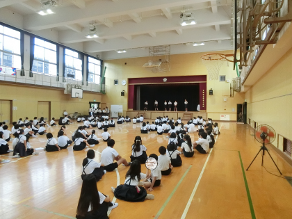 今日の朝の集会は「なんでやねんゲーム」でした。主なルールはじゃんけん列車と同じで、音楽の代わりに集会委員の人たちがなんでやねんの歌を歌ってくれました。