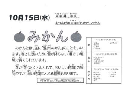 みかんは、早生の緑色のみかんです。「なぜ緑色なの」という質問がありましたが、「みかんはいろんな時期に、緑からオレンジ色になるまでおいしく食べられるからだよ。今は緑色のみかんの季節です。」というと、「ふうん」と納得しているようでした。