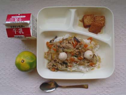 中華丼は子どもに人気の献立です。あつあげの中華だれかけもなかなかの人気です。