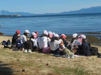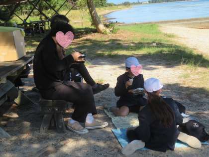 湖畔の浜辺で仲間と食べる昼食は格別です!