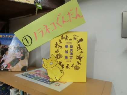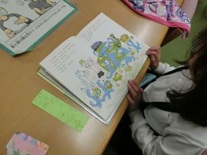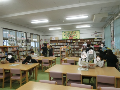 図書室では、お昼休みにキャラクター探しとおみくじを配っていました。
