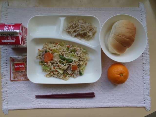 しょうゆ味の和風焼きそばはかつおぶしをかけていただきます。かつおの風味が食欲をそそります。もちろん、焼きそばパンにするのもおいしいですね。