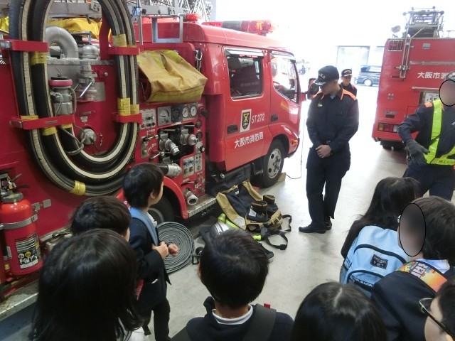 今日は校外学習で城東消防に行きました。初めに大阪市の消防署についてのお話を聞き、その後3台の消防車を見学させていただきました。