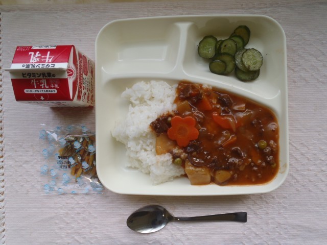 ハヤシライスは、かわいいラッキーにんじん♪が入って、子どもに人気の献立です。ごはんとハヤシルウを丁度よく配膳するのが少し難しいですが、給食当番は、頑張ります。