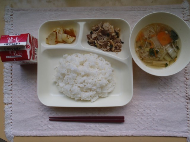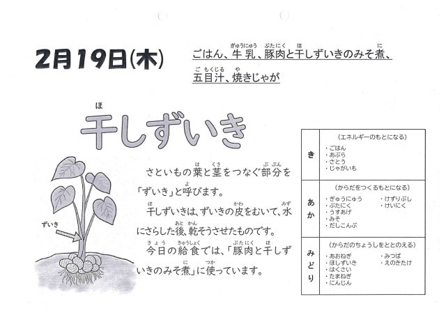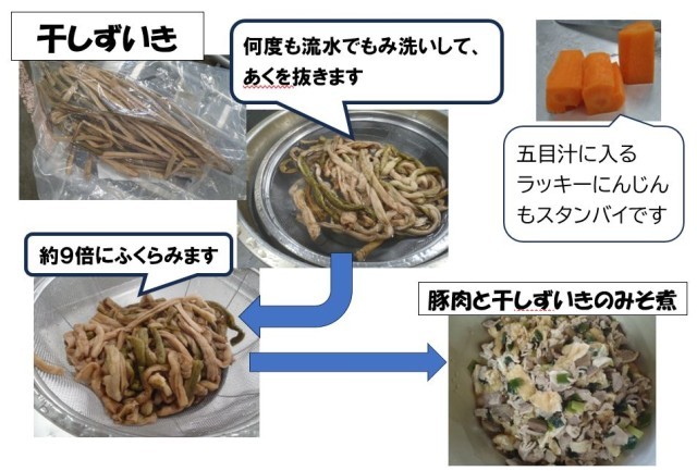 干しずいきは、家庭ではなかなか食べない食材ですが、給食は年に1回か2回使われています。今年は、不作で、いつもの半分の量しか使えませんが、豚肉やうすあげ、青ねぎと合わせてみそ味の煮ものにしています。あくを抜くために、流水で何度ももみ洗いをします。寒い時期は手が冷たくなりますが、子どもたがおいしく食べられるように、頑張って作ります。しゃきっとした歯ごたえがよいアクセントになる煮ものです。もちろん、残食はほとんどありません。