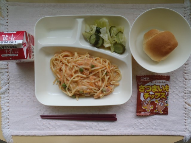 桜色のさけのスパゲッティは子どもに人気の献立です。そのまま食べても、パンにはさんでも、自由です。グリンピースの緑色が目を引きます。