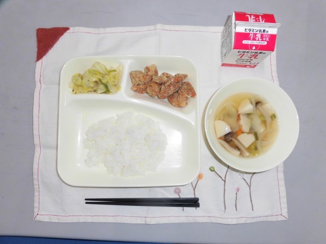 今日は、子どもたちに人気な鶏肉のたつたあげです!!揚げ玉も人気で、食缶が空になっていました。