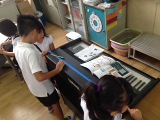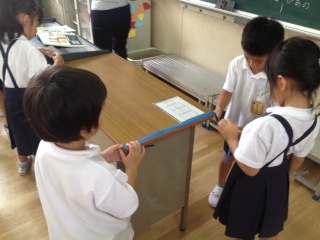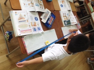長さを測る勉強です。紙テープを使って長さを比べています。