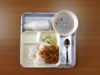 新メニューです。児童が応募した、献立コンクールの入賞作だそうです。タコスはメキシコ料理のスパイシーな味付けでした。「もずくと白ねぎのスープ」はもずくとオクラのネバネバスープでした。