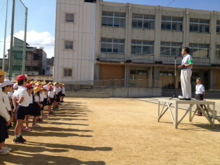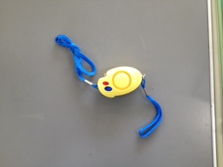 全校朝会で城東警察のおまわりさんから、「防犯ブザー」の説明がありました。城東区役所から区内の小学生全員に配られたものです。通学時だけでなく、遊びに出かけるときにも活用してください。