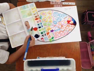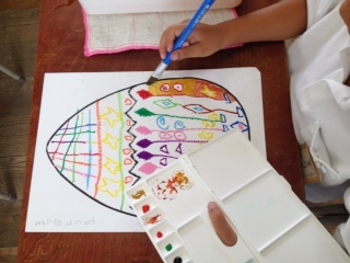 クレパスと絵具を使って色とりどりのたまごを描いていました。