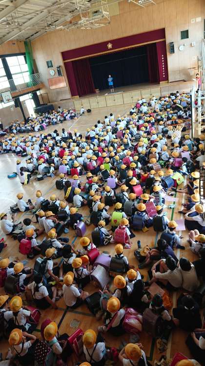 すみやかに全員講堂に集まることができました。阿部先生からは、先週、大津市の交差点で信号待ちをしていた保育園児の列に車が突っ込み、死傷者が出た痛ましい事故について触れ、「交通ルールを守り、周りをしっかりと確認して、自分の身の安全を守ってください。」とお話がありました。