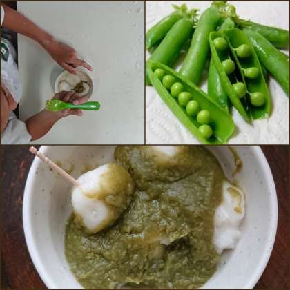写真に写っている緑色の餡は、自分達で収穫したエンドウマメを使って作ったエンドウマメ餡です。