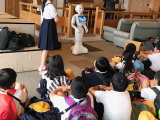 賢島パークホテルみち潮に到着しました!ホテルの説明をペッパー君がしてくれています!みんな真剣に聞いています!