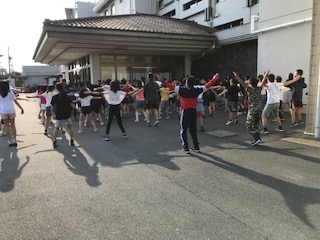 絶好の天気の下、修学旅行2日目がスタート!!寝ている体を起こすために体操をしています!!