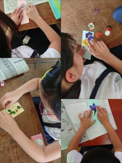 文化クラブでは、押し花づくりをしました。アイロンをあて水分を抜いてから、丁寧に形を整えて貼り付けます。ひとりひとり素敵な作品ができました。